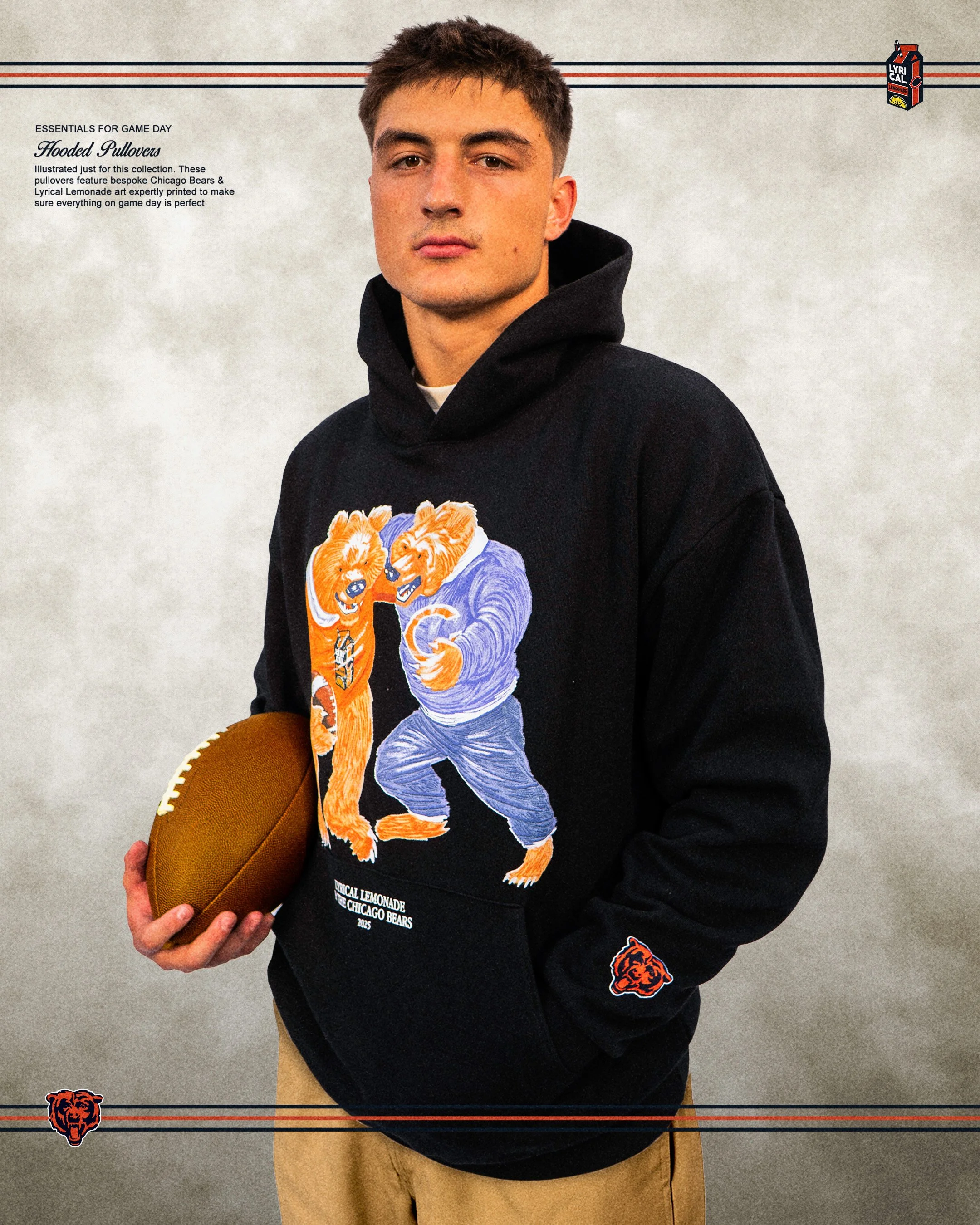 For this collection, we were able to capture Chicago Bears players Rome Odunze and Colston Loveland in the various pieces. We wanted the style to feel vintage, but nothing too on the nose to anything the Bears had done in the past. We were also able to include starting quarterback Caleb Williams in the collection as well. He wore the letterman jacket during the press conference after their first win of the season against the Cowboys. Lyrical Lemonade’s designer George Hammond handled the graphic design when it came to creating the official collection graphics.